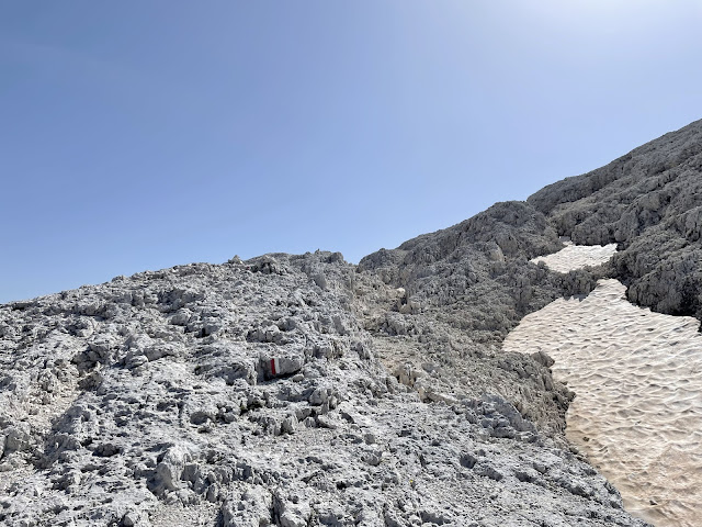 Da qui iniziano una serie di saliscendi attraverso la bianca roccia dolomitica: è fondamentale prestare attenzione ai segnavia dipinti sulle rocce, sono un po' scoloriti e non sempre immediatamente visibili.